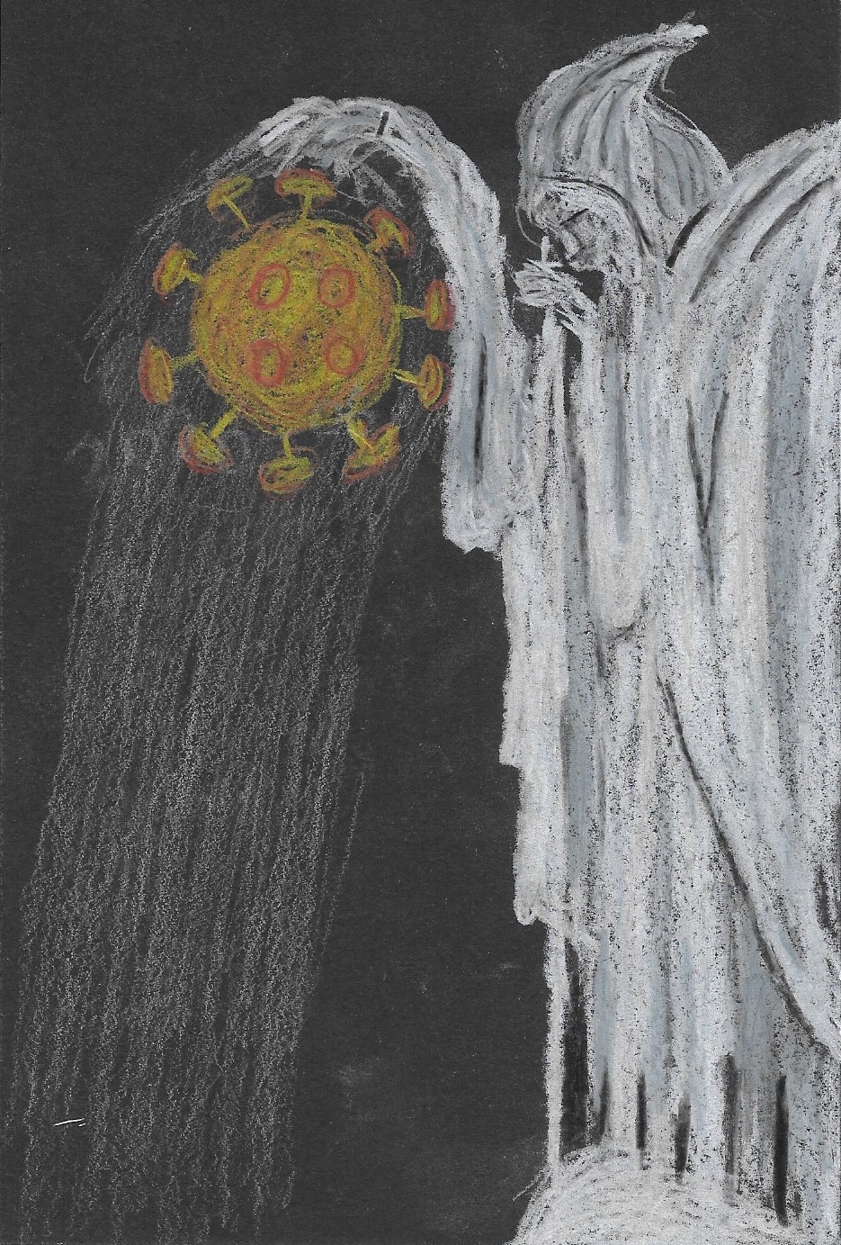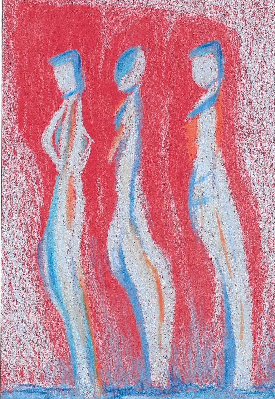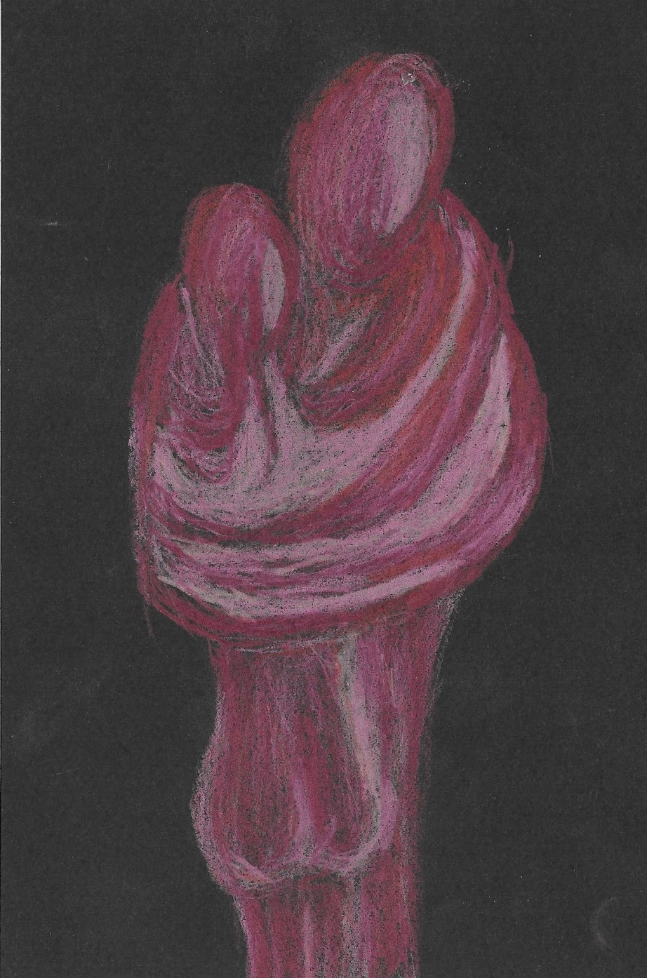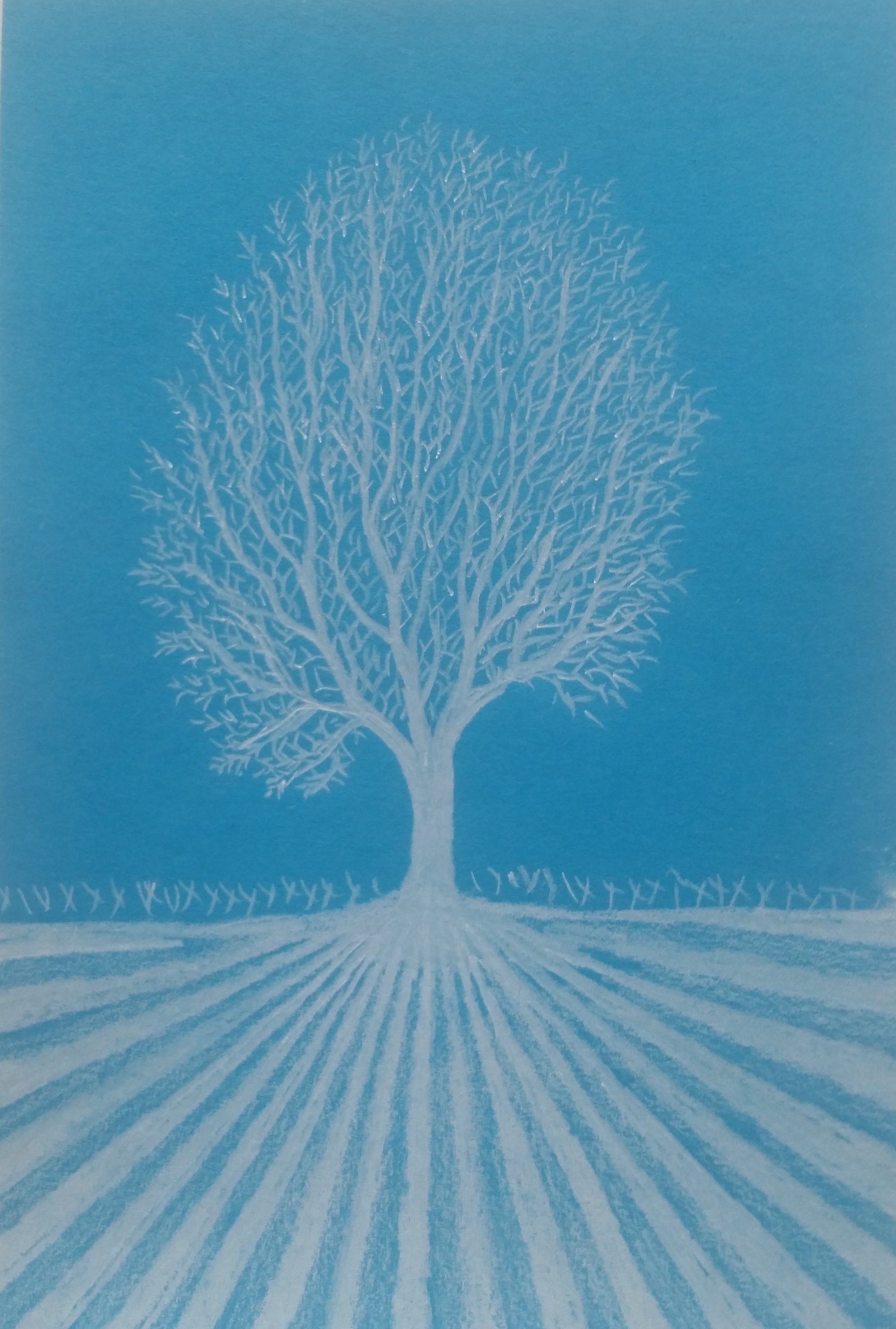 Hvid farveblyant på gråt papir. 50 x 70 cm. (tegning 40 x 50)