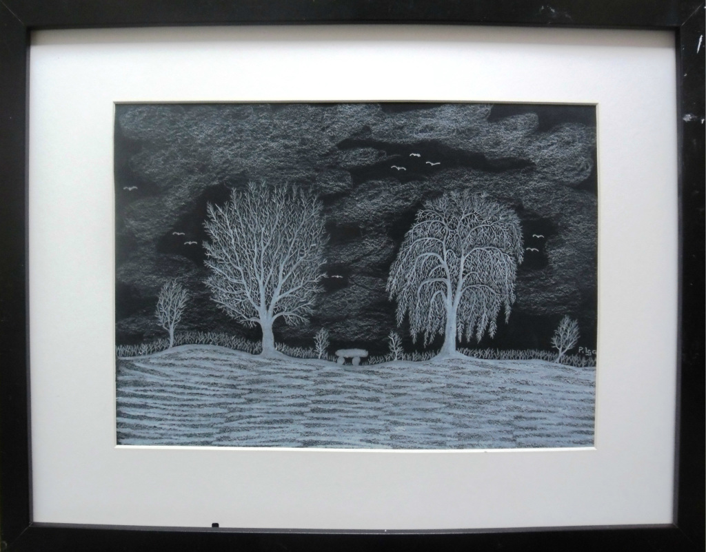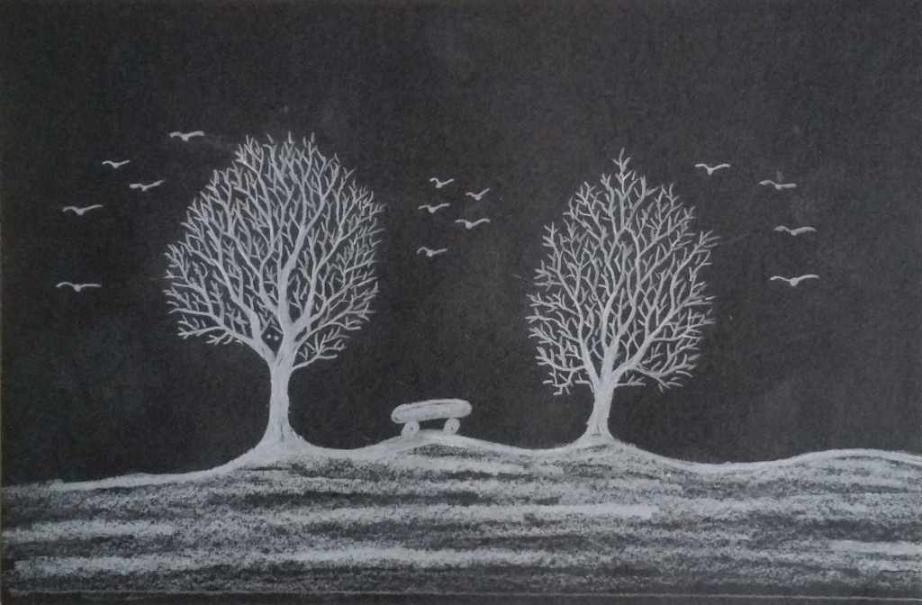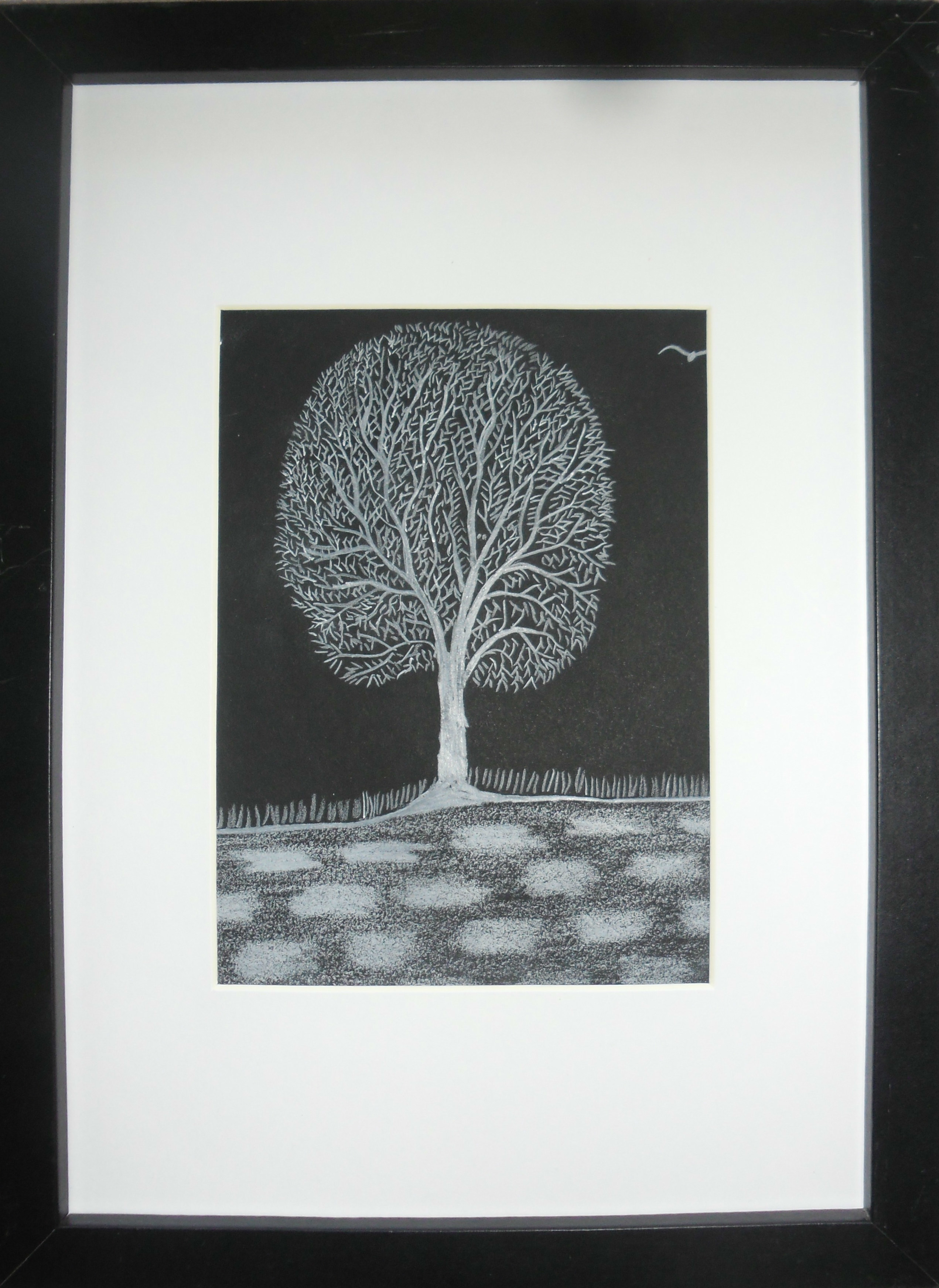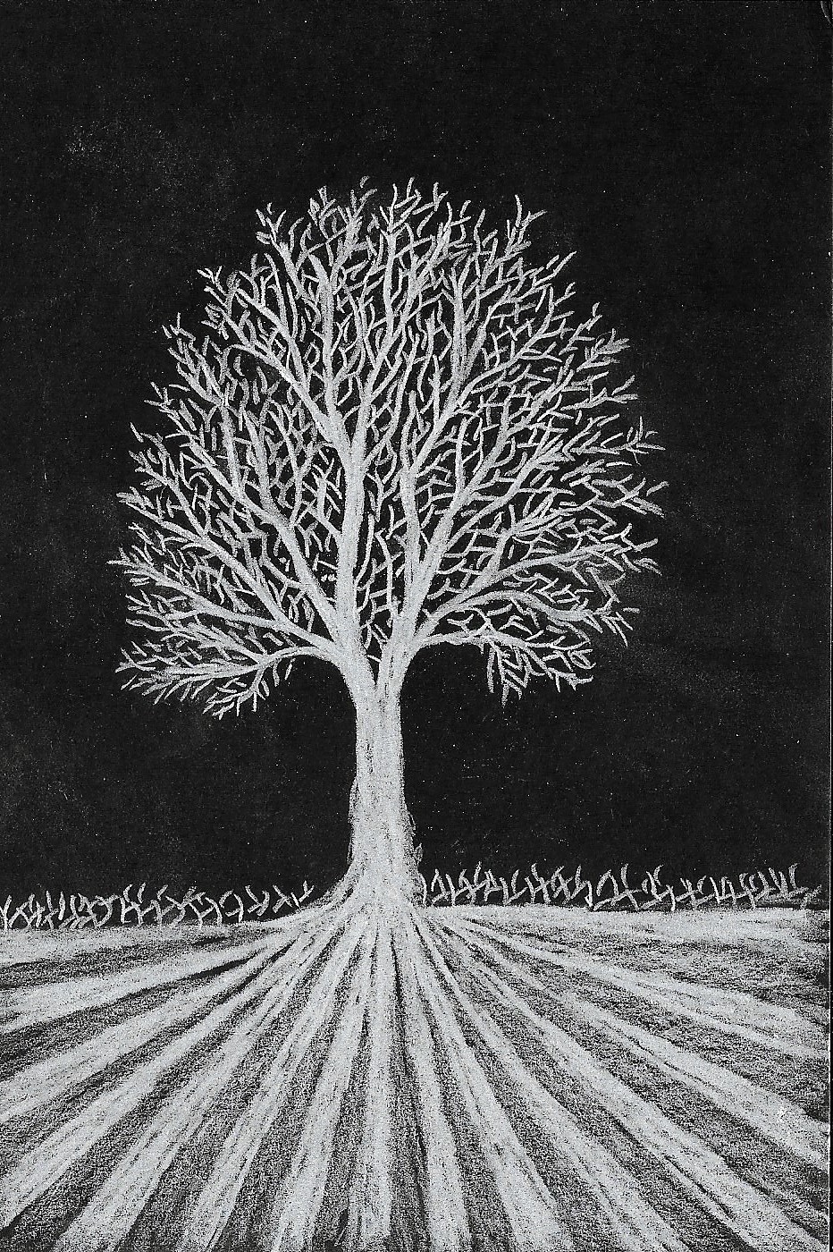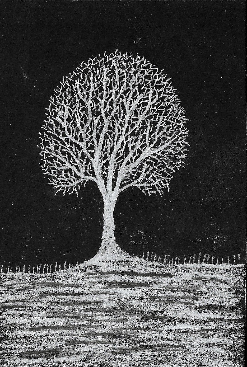 Hvid farveblyant på sort papir. 50 x 70 cm. (tegning 40 x 50)