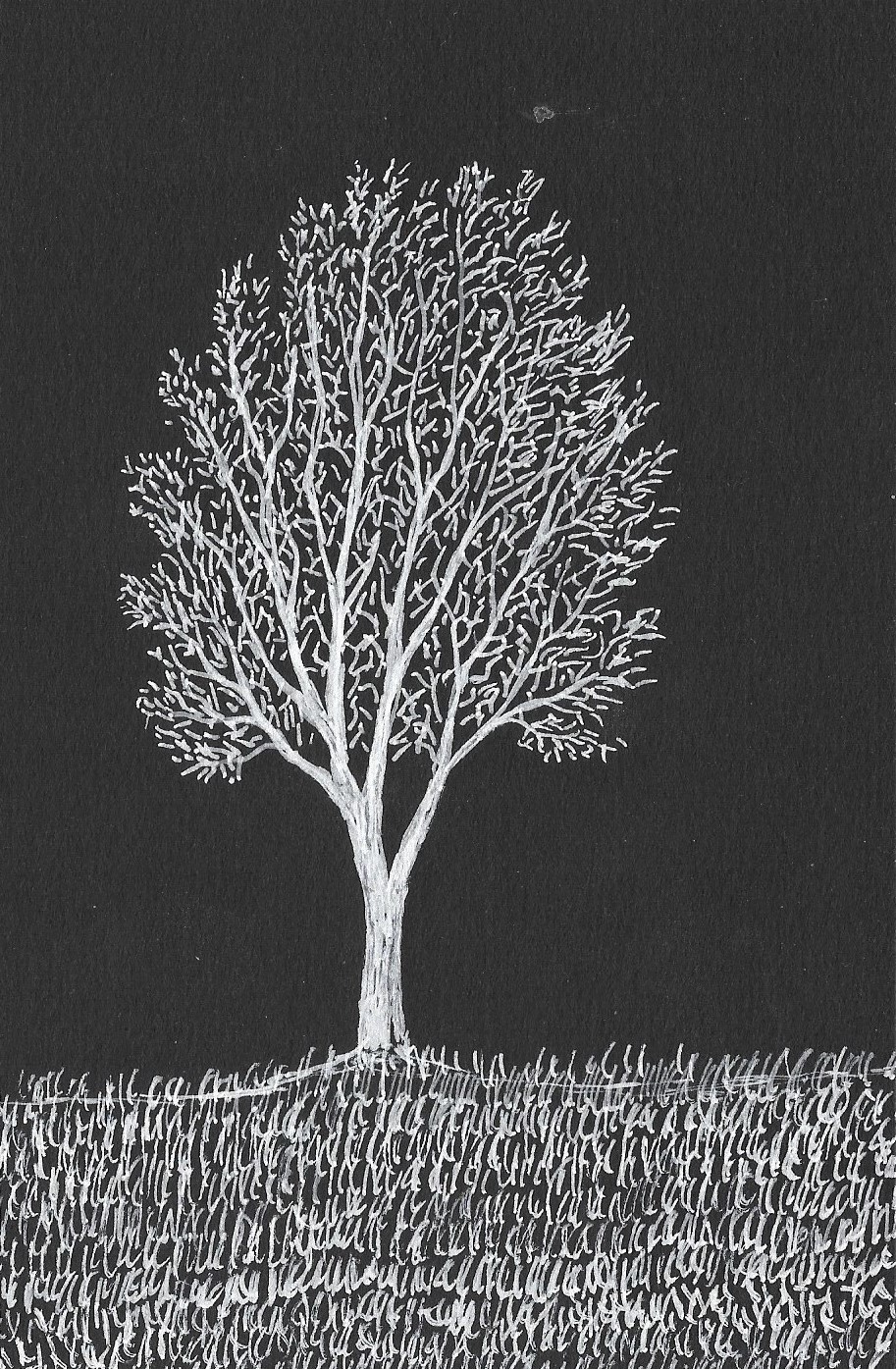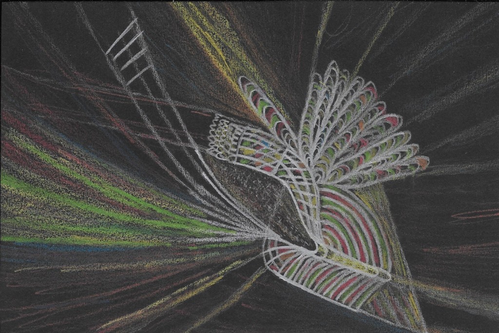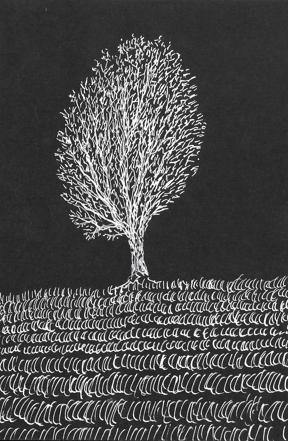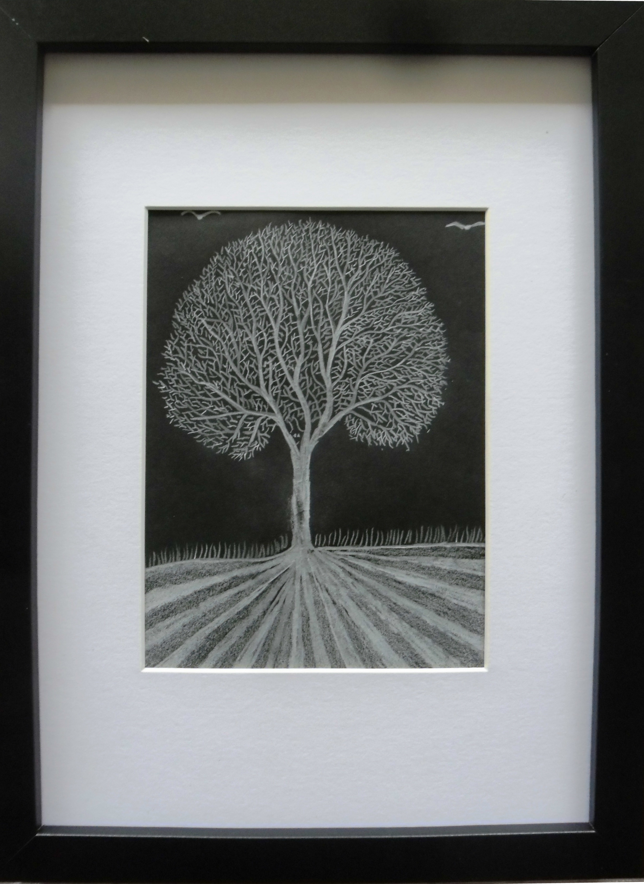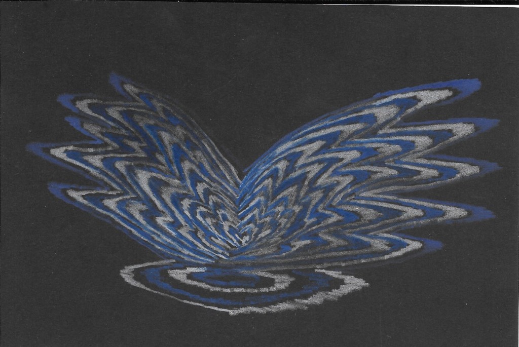 Hvid farveblyant på sort papir. 50 x 70 cm. (tegning 40 x 50)