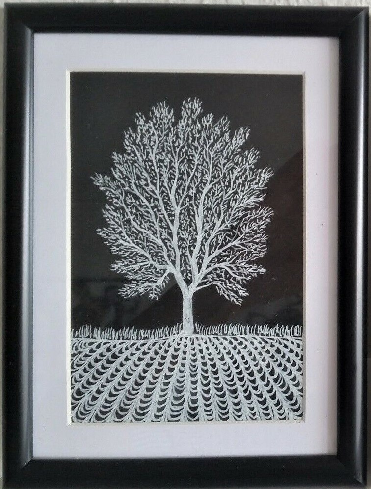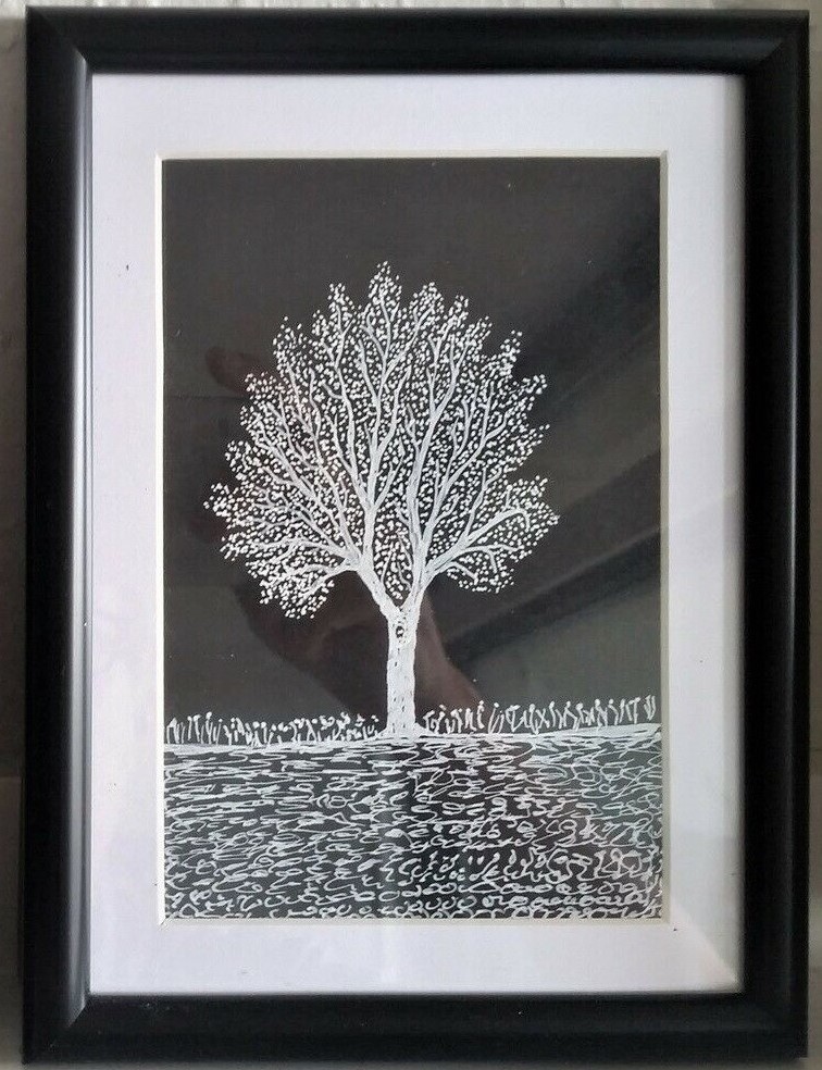 1-2: Hvid posca tusch på sort papirpapir i boxramme. Pris 150,00