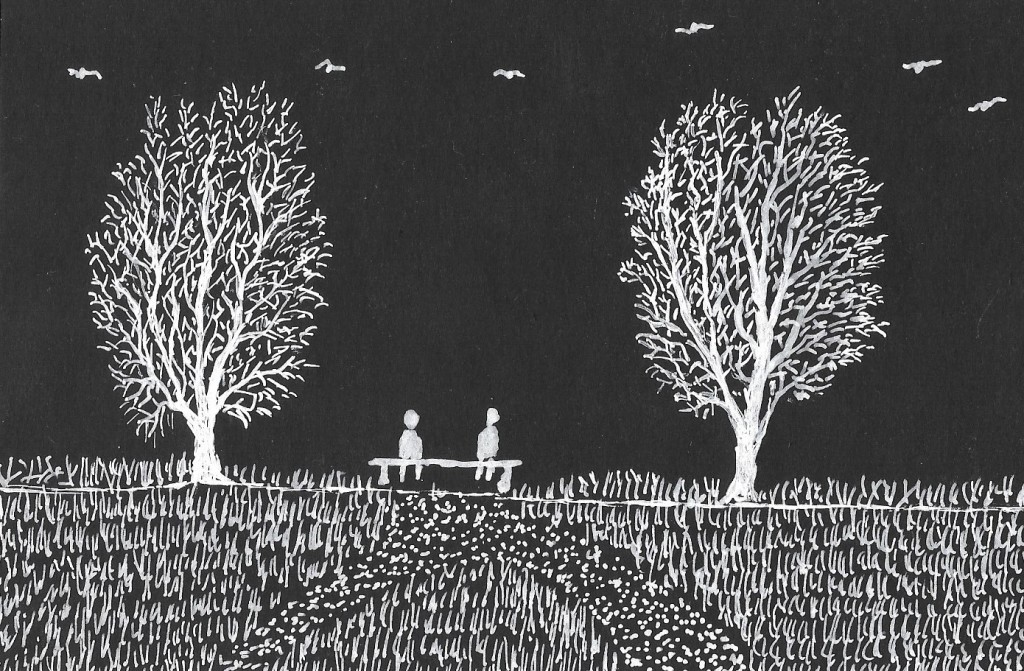 Et træ, en ugle, 2 børn på en bænk, en mus og 3 måger.